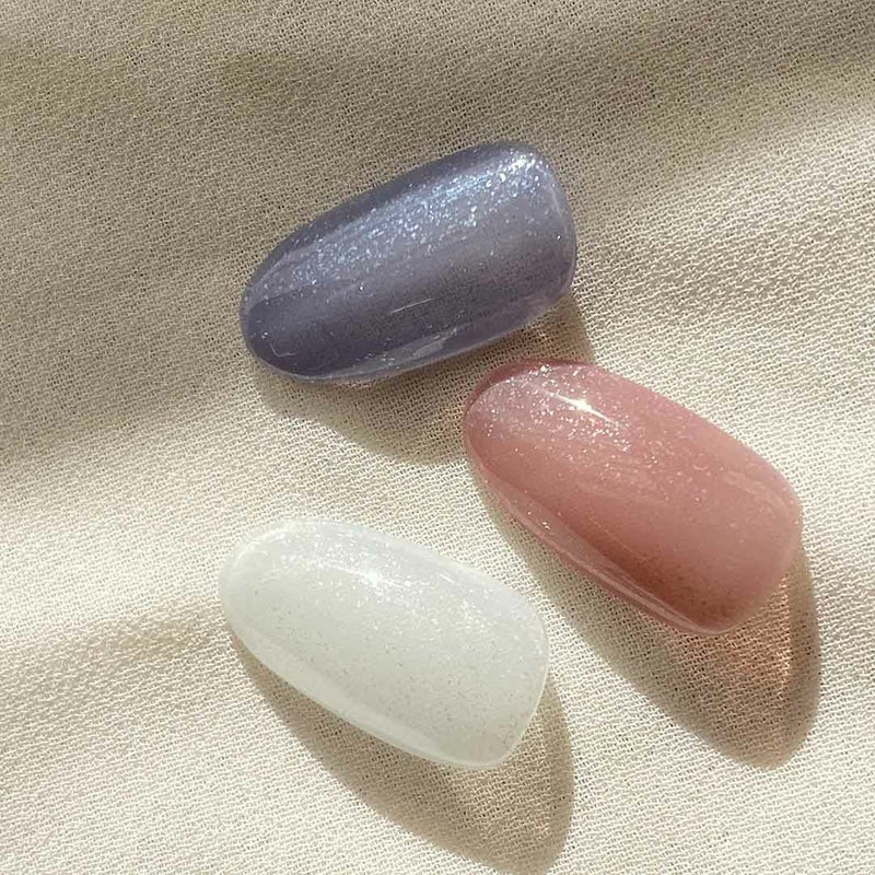 透け感の強いホワイトブルーをベースに超微粒子にランダムカットされたホワイトフレークとプラチナシルバーのようなグリッターの入ったほんのり水色のクリアホワイトカラーです。